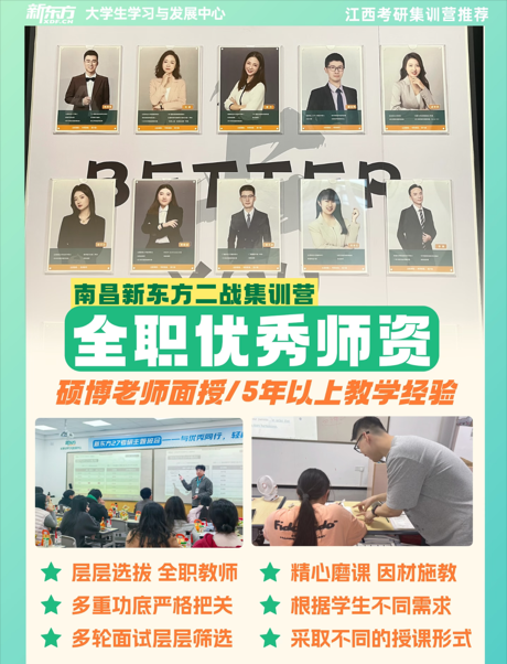教学质量是培训机构的核心竞争力,而师资则是教学质量的灵魂。南昌新东方考研之所以口碑出众,离不开其“炼狱级”的师资筛选标准和完善的师资培养体系,确保每一位授课教师都具备过硬的专业能力和丰富的教学经验,能真正帮助考生提升。