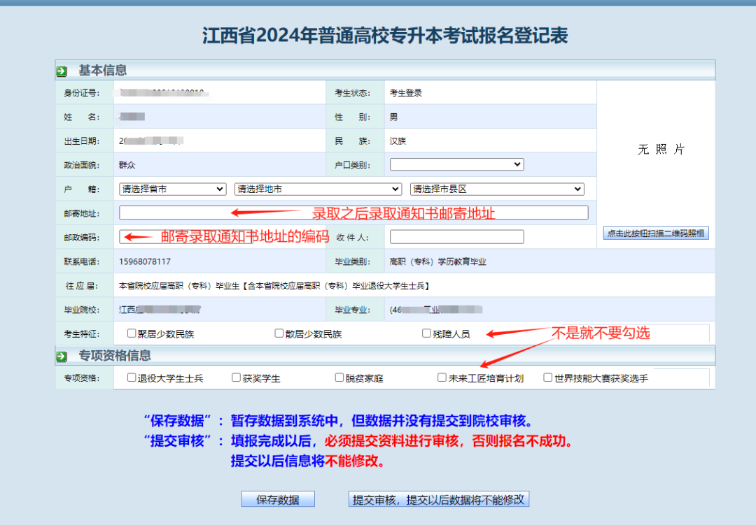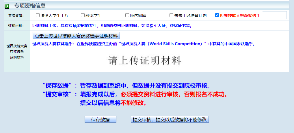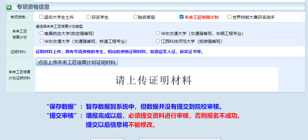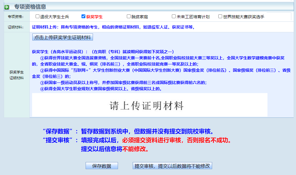 注:若为建档立卡专项考生系统已自动匹配,其他专项考生需上传证明材料