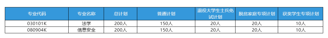 已官方公布:退役大学生士兵免试招生计划40人,法学、信息安全专业各20人。