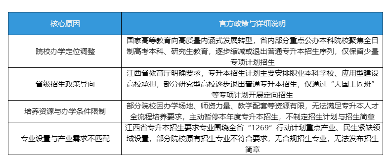 表5 2026年江西专升本院校停招/未发布简章核心原因汇总