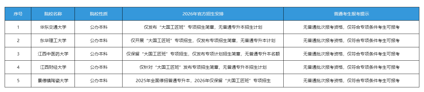 表3 2026年江西专升本仅招专项计划院校详细名单
