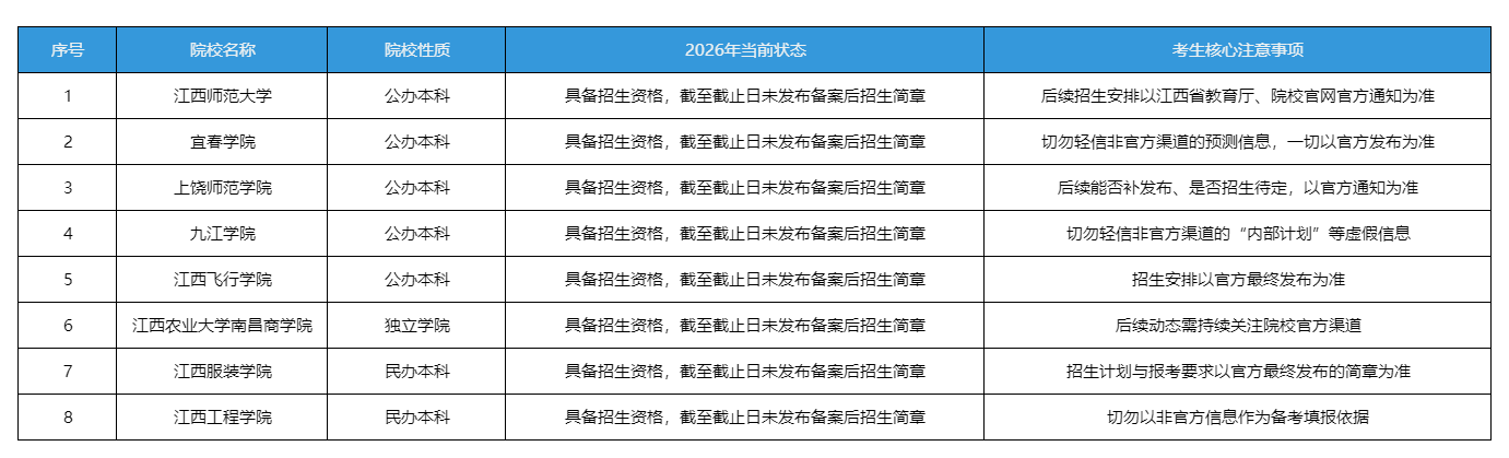 本类院校具备2026年江西专升本招生资格,但截至2026年2月28日24时,仍未在官方渠道发布备案后的招生简章。后续能否补发布、是否开展本年度招生,均以江西省教育厅、院校官网官方通知为准,考生切勿轻信非官方信息。
