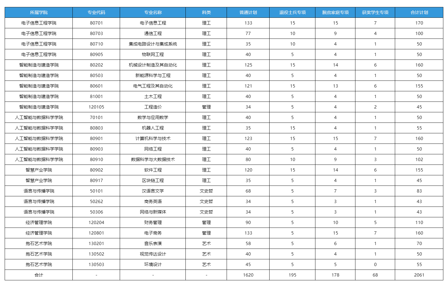 江西工程学院 2026 年专升本招生总计划为 2061 人,其中普通计划 1620 人,退役士兵专项计划 195 人,脱贫家庭专项计划 178 人,获奖学生专项计划 68 人。具体分专业招生计划如下表所示:
