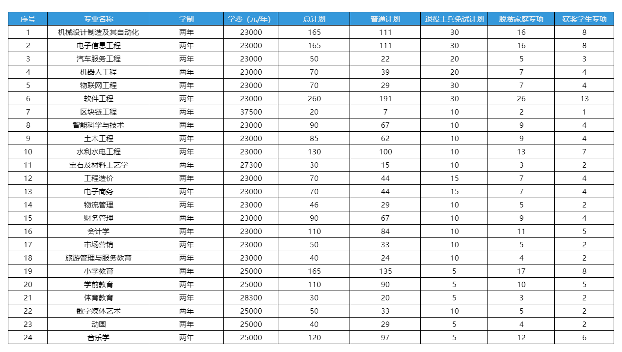 所有专业均设置普通计划、退役士兵免试计划、脱贫家庭专项、获奖学生专项,学费标准与2025年一致,无调整。