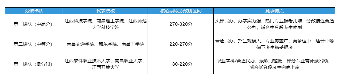 结合2026年官方录取数据,按录取分数线高低,将江西专升本民办院校划分为三大梯队,清晰呈现各院校分数差异,方便考生快速定位适配院校: