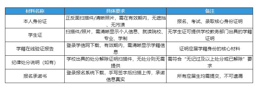 不同身份考生(应届生、往届生、专项生)所需材料差异较大,以下为分类清单,考生可对照自身身份精准准备,避免遗漏: