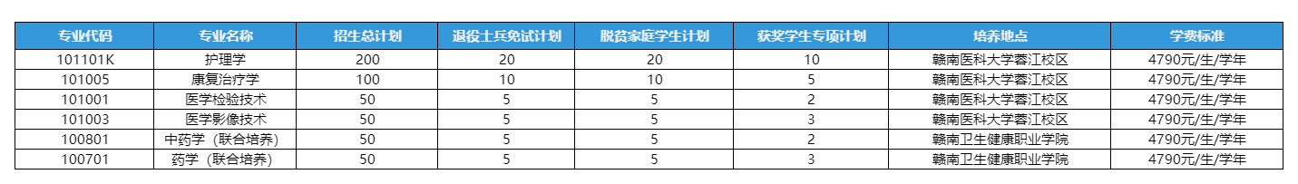 本次招生的医学类专业具体计划分配、培养地点、收费标准如下表所示,所有计划最终以江西省教育主管部门审核批准为准: