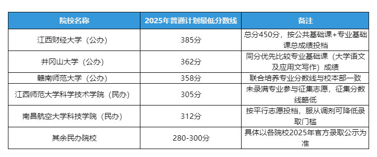 2026年江西专升本汉语言文学专业录取分数线尚未公布,以下为2025年全省各院校该专业录取最低分数线(普通计划),供考生参考,最终2026年分数线以江西省教育考试院及各院校官方发布为准,分数线受招生计划、报考人数、考试难度影响,可能存在波动。