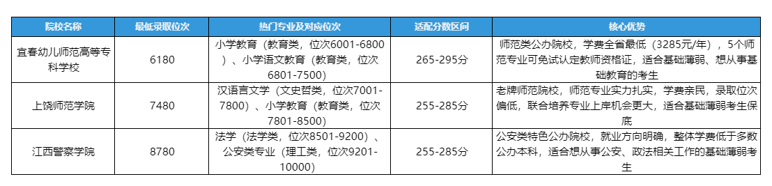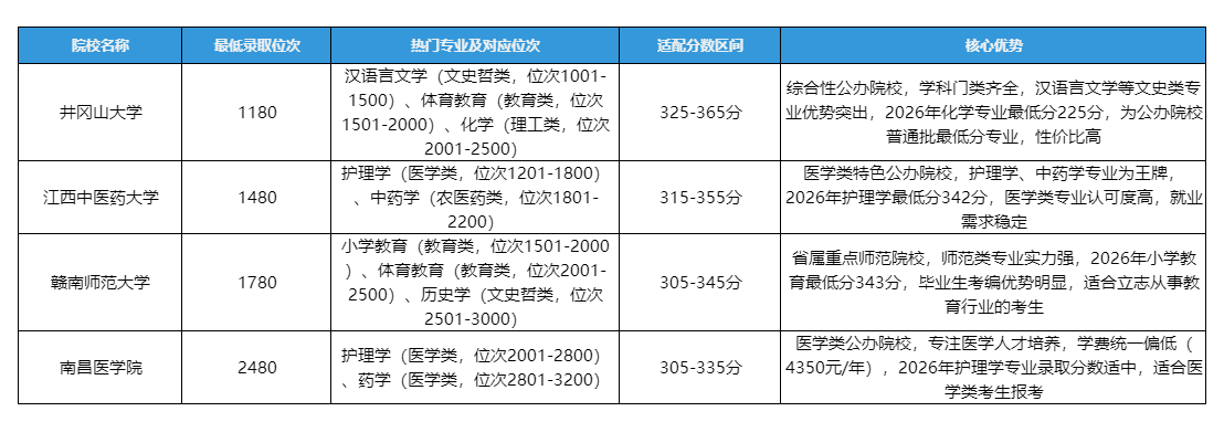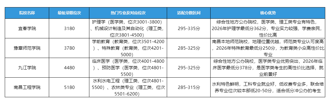 结合自身需求选择公办/民办:预算有限、追求学历认可度,优先选择公办院校(尤其是第三、四梯队保底公办);基础薄弱、想稳妥上岸,优先选择民办院校(优质民办冲稳,普通民办保底);同时关注院校特色,如医学类考生优先选择江西中医药大学、南昌医学院等院校,师范类考生优先选择师范类院校。