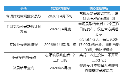 缺额专属原则:补录仅使用对应专项类别未完成的缺额名额,不得占用普通批次招生计划,院校不得擅自调整专项计划类别与招生人数。