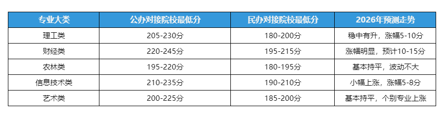 低分段考生(180-210分)重点关注民办对接院校及冷门专业,如农林类、部分理工类专业,把握补录机会。