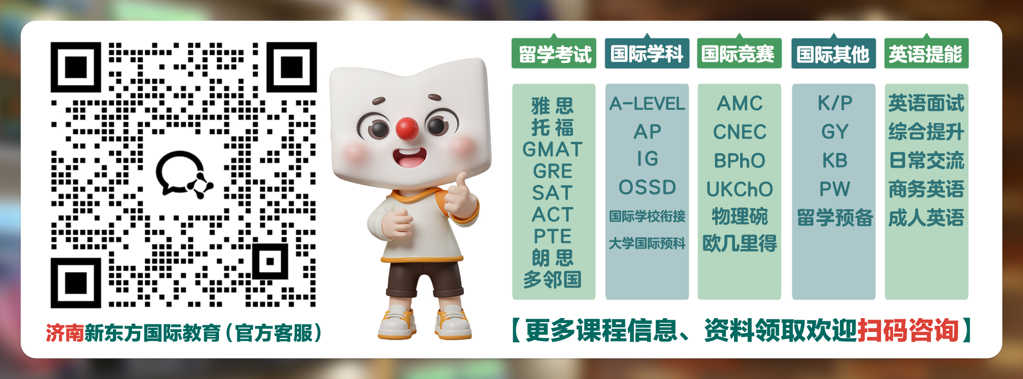 济南新东方国际教育专注于雅思、托福、AP、IB、A-Level、SAT&ACT、OSSD、IGCSE、AEAS、小托福、KET、PET、Global You英语提能课程等国际(课程)考试,提供专业系统的备考辅导及贴心靠谱的规划指导~有任何课程需求请扫描下方二维码咨询~