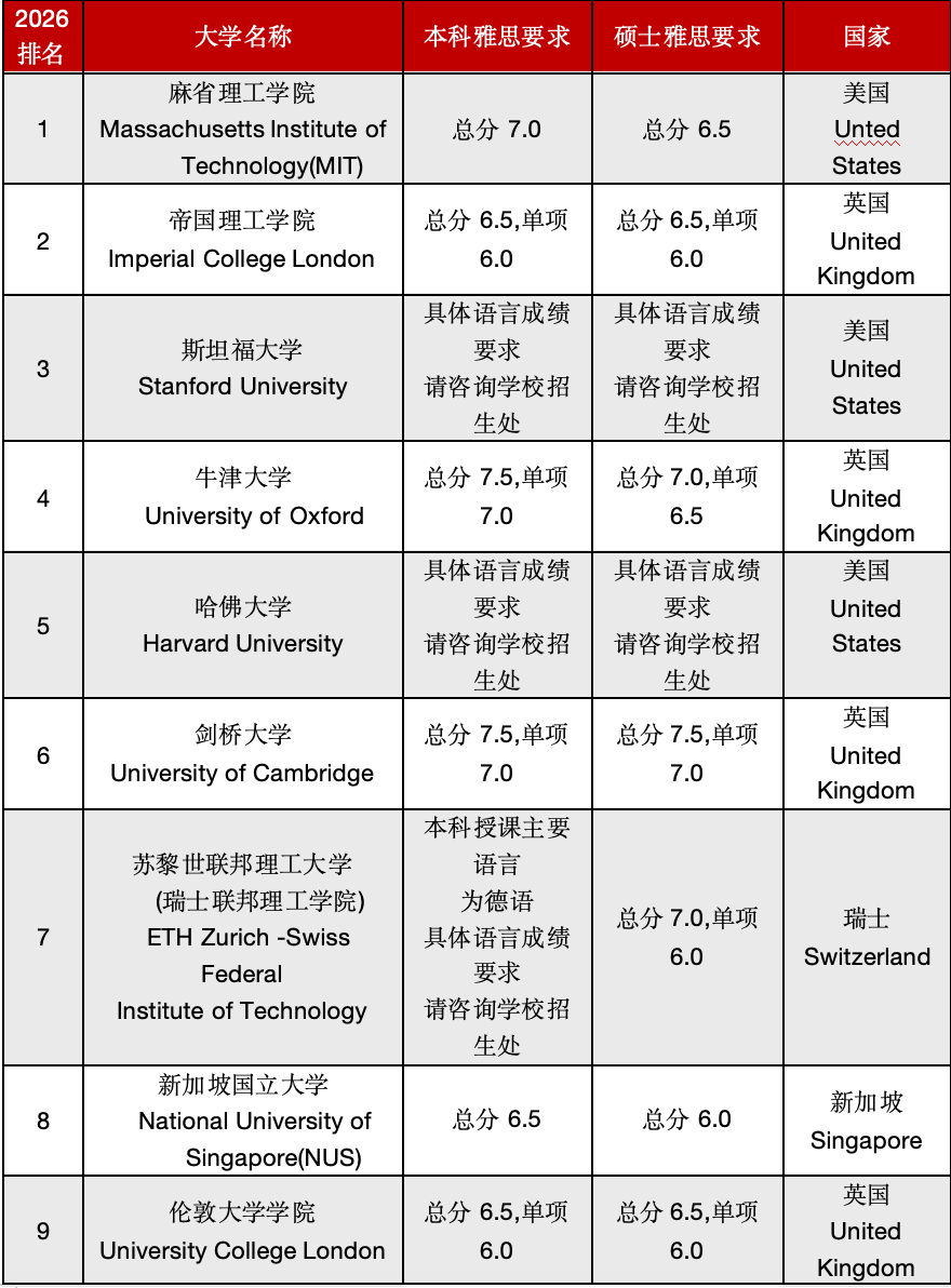 而当我们将目光投向留学深造,2026QS前50的顶尖高校,对雅思成绩有着明确且严格的要求,这无疑是大家迈向世界名校的关键门槛。英国牛津大学、剑桥大学,雅思总分需达到 7.5 分,且各单项不低于 7.0 分;帝国理工学院,雅思要求分为两档,Standard 标准为总分不低于 6.5 分,单项不低于 6.0 分,Higher 标准则总分不低于 7.0 分,单项不低于 6.5 分。美国的顶尖学府也毫不逊色,如康奈尔大学、纽约大学等,雅思总分要求 7.5 分 。加拿大的多伦多大学,雅思总分需 7.0 分。亚洲地区,新加坡国立大学雅思要求 6.5 分,南洋理工大学为 6.0 分,韩国延世大学英语授课项目要求雅思 6.0 分 。欧洲的慕尼黑工业大学,雅思要求 6.5 分 。面对这些顶尖院校的高要求,提升雅思成绩迫在眉睫,高效备考刻不容缓!