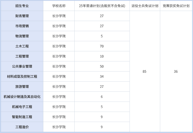 长沙学院2025年专升本招生总计划数约405人,其中普通计划数(含脱贫家庭毕业生计划)为284人;竞赛获奖免试计划36人,退役士兵免试计划85人。具体计划见下表。