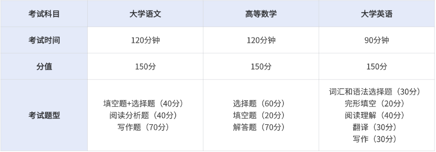 大学语文或高等数学:满分150分,考试时间120分钟。大学语文题型有选择题、填空题、阅读分析题、写作题;高等数学题型有选择题、填空题、解答题。
