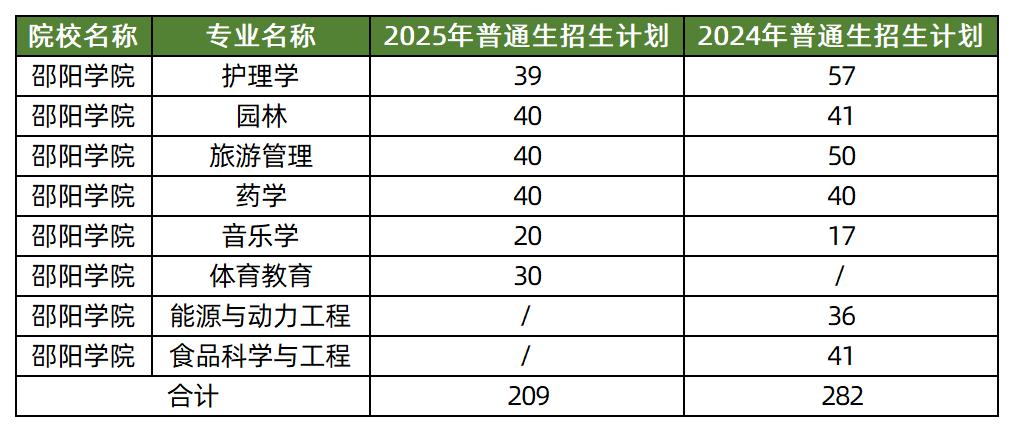 邵阳学院2025年停招了能源与动力工程、食品科学与工程专业,新增了体育教育专业;普通计划招生总数由282人减少为209人,缩招73人。