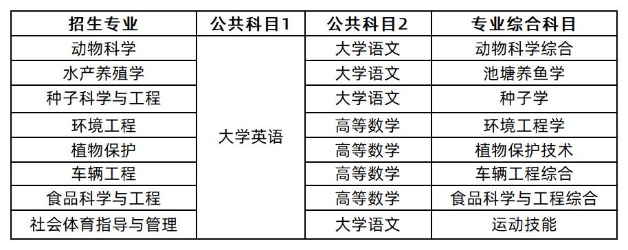 第八条 招生专业。我校拟招生专业为动物科学、水产养殖学、种子科学与工程、环境工程、植物保护、车辆工程、食品科学与工程、社会体育指导与管理。