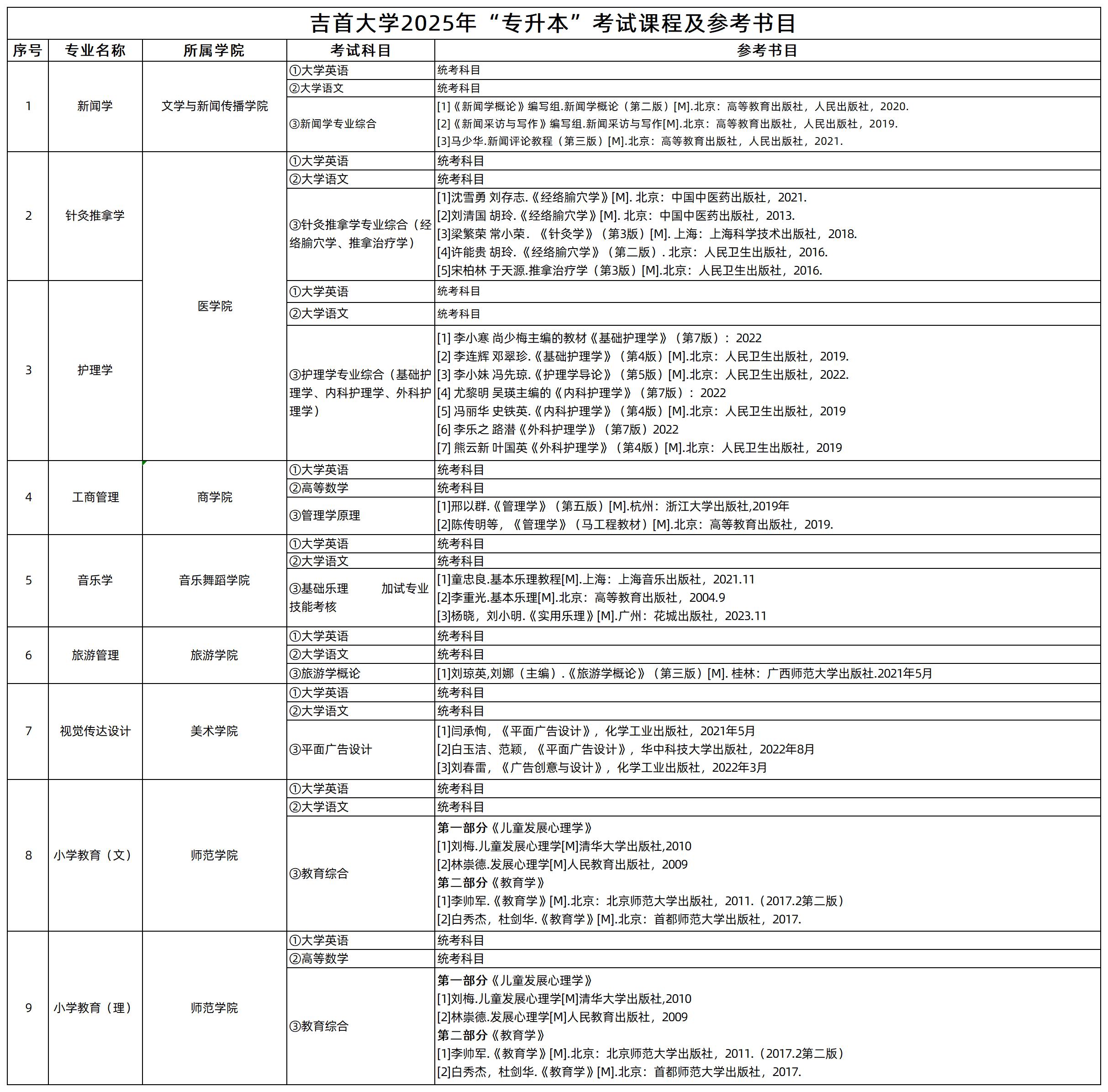 2025年吉首大学专升本共有9个招生专业,各专业考试课程及参考书目汇总如下。