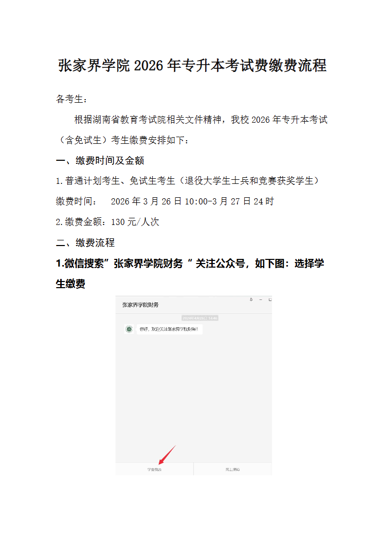 张家界学院2026年专升本考试缴费办法