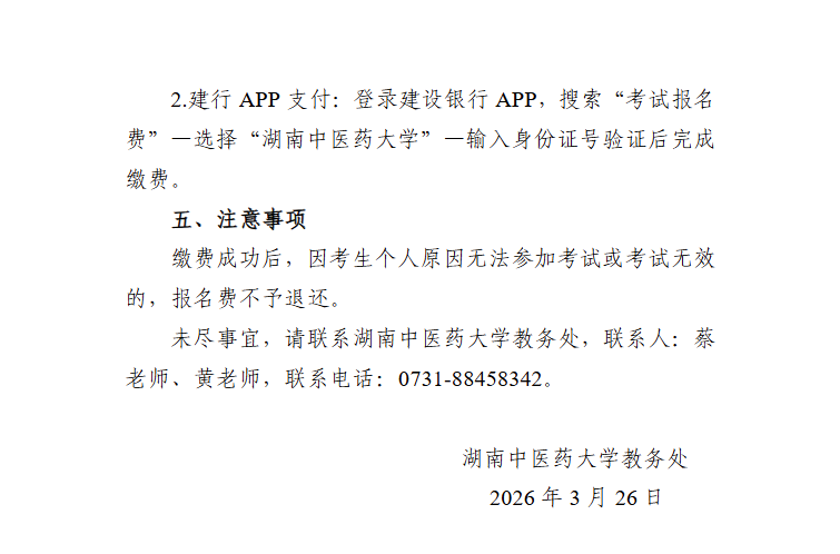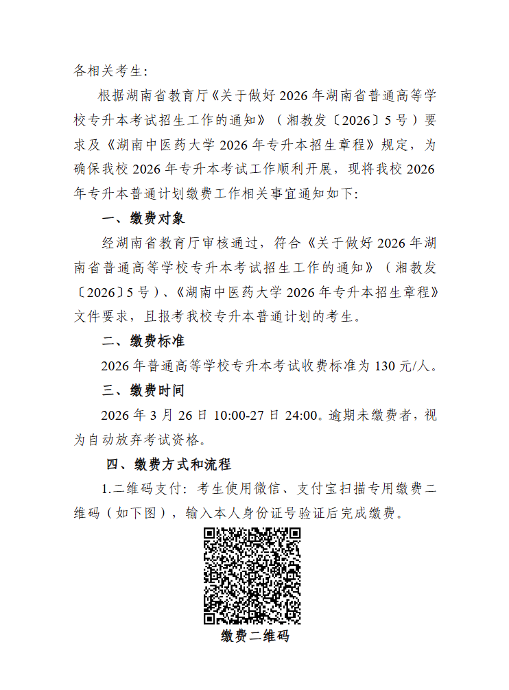 湖南中医药大学2026年专升本考试缴费办法