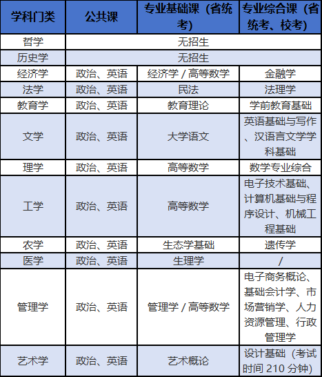专业综合课(省统考):法理学、电子技术基础、计算机基础与程序设计、电子商务概论、基础会计学、市场营销学、人力资源管理、行政管理、金融学、国际贸易理论与实务、数学专业综合、英语基础与写作、汉语言文学学科基础、设计基础、学前教育学、遗传学、机械工程基础。