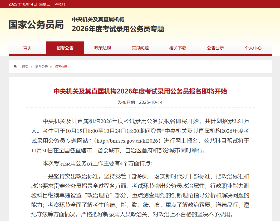 2026年国家公务员考试公告已发布