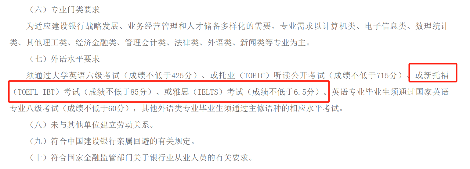 部分国企在校园招聘的过程中会对求职者的英语水平有一定要求,例如在中国建设银行总部2026年度校园招聘公告中,要求应聘者的六级成绩不低于425分,或雅思成绩不低于6.5分,或新托福成绩不低于85分。