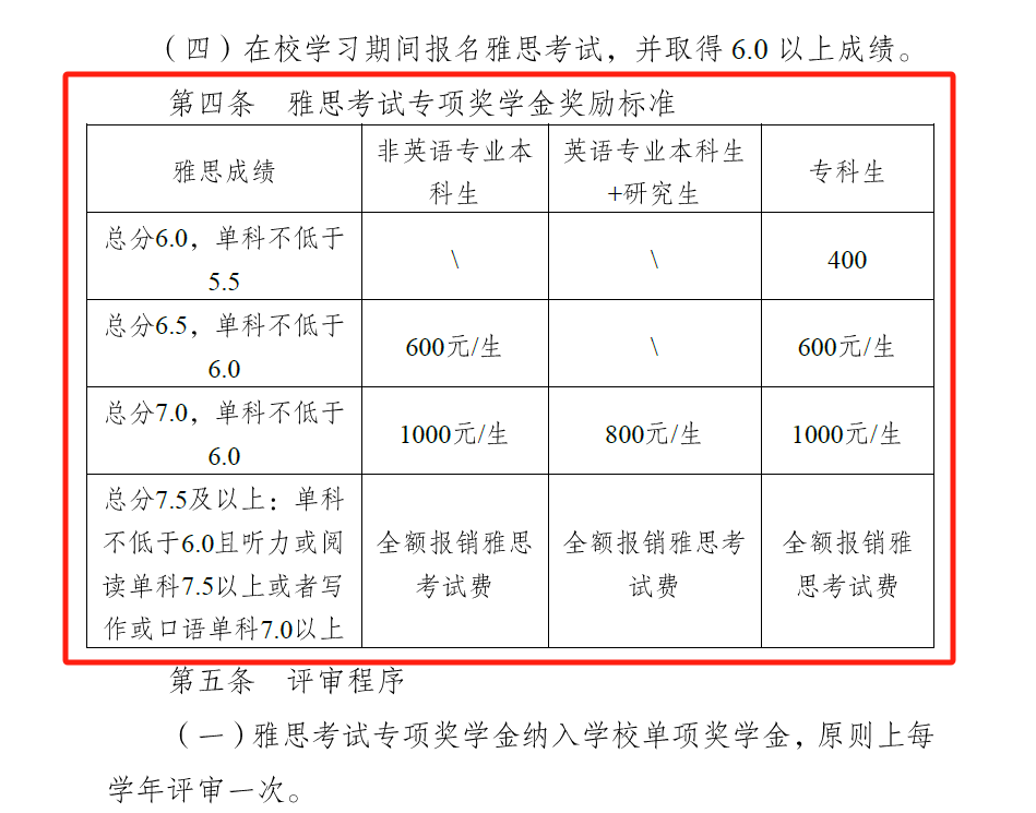 比如,成都大学师范学院设置了毕业生雅思考试专项奖学金,依据不同分数给予学生不同的奖金或给学生直接报销考试费!