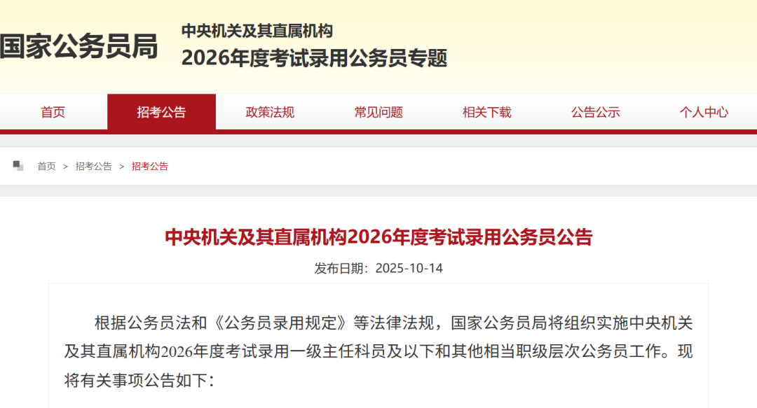 近日,2026年国考公告正式发布!本次国考全国计划招录3.81万人(去年人数为3.96万)。