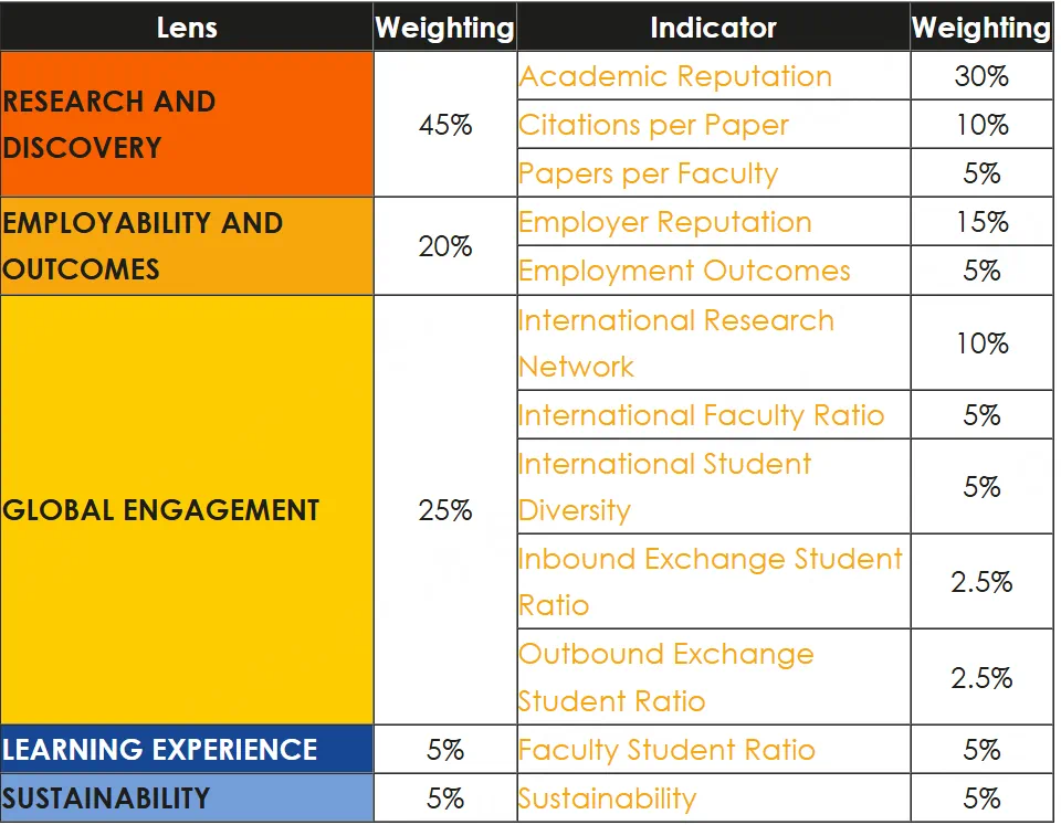 欧洲大学排名和QS世界大学排名指标有很多相似的地方,比如“学术声誉”、“雇主声誉””、“就业成果”等。