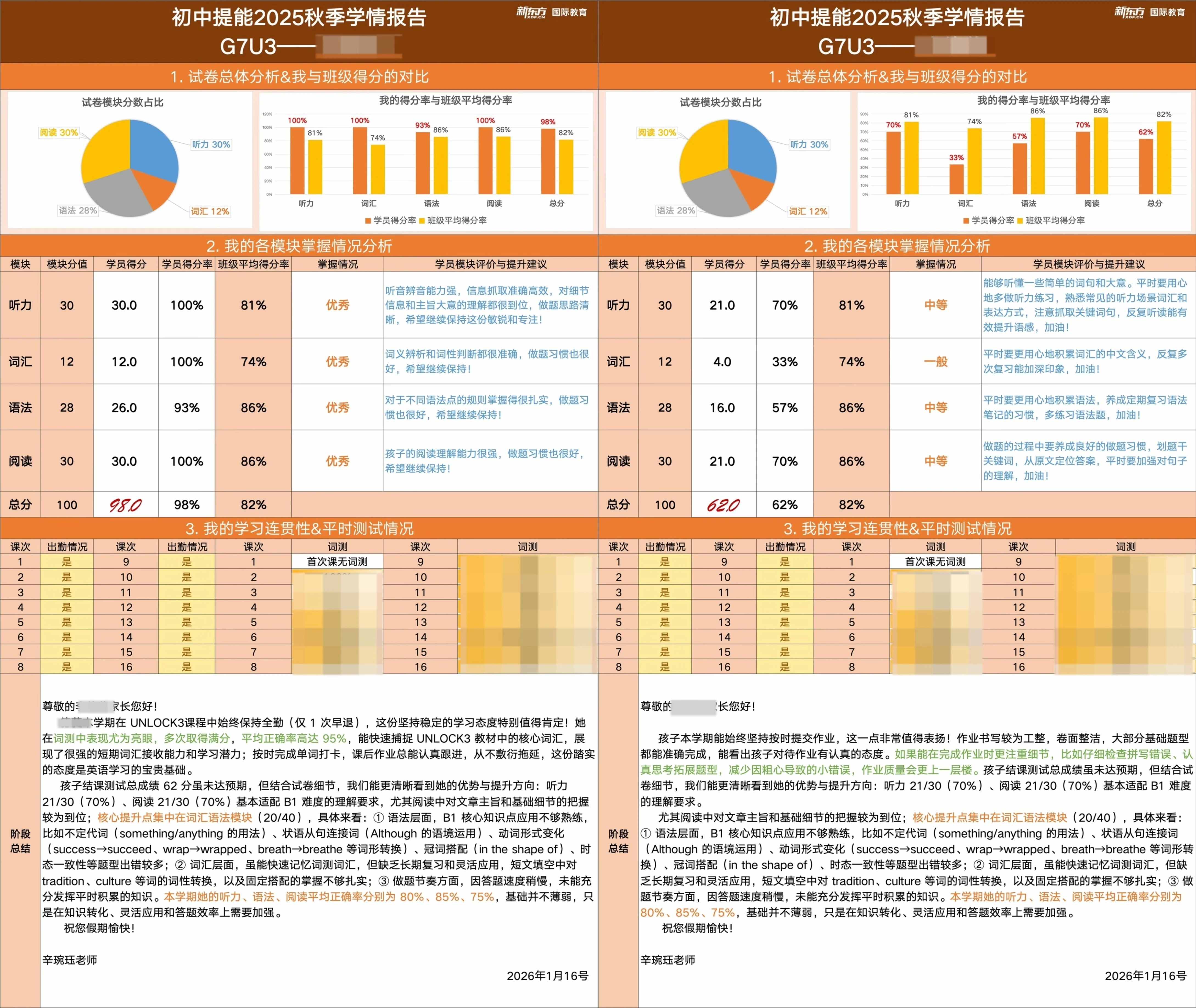 2025年,深圳新东方初中提能项目与数千名学子并肩前行,始终走在语言提升与名校追逐的路上。我们累计开展100+次深度教研,完成了500+次磨课实践,我们为学员量身定制1600+份个性化学习方案,5000+份结班报告。累计完成30000+学情反馈,覆盖课堂表现、作业质量与心理状态,召开100+场家长会,构建家校共育的桥梁。