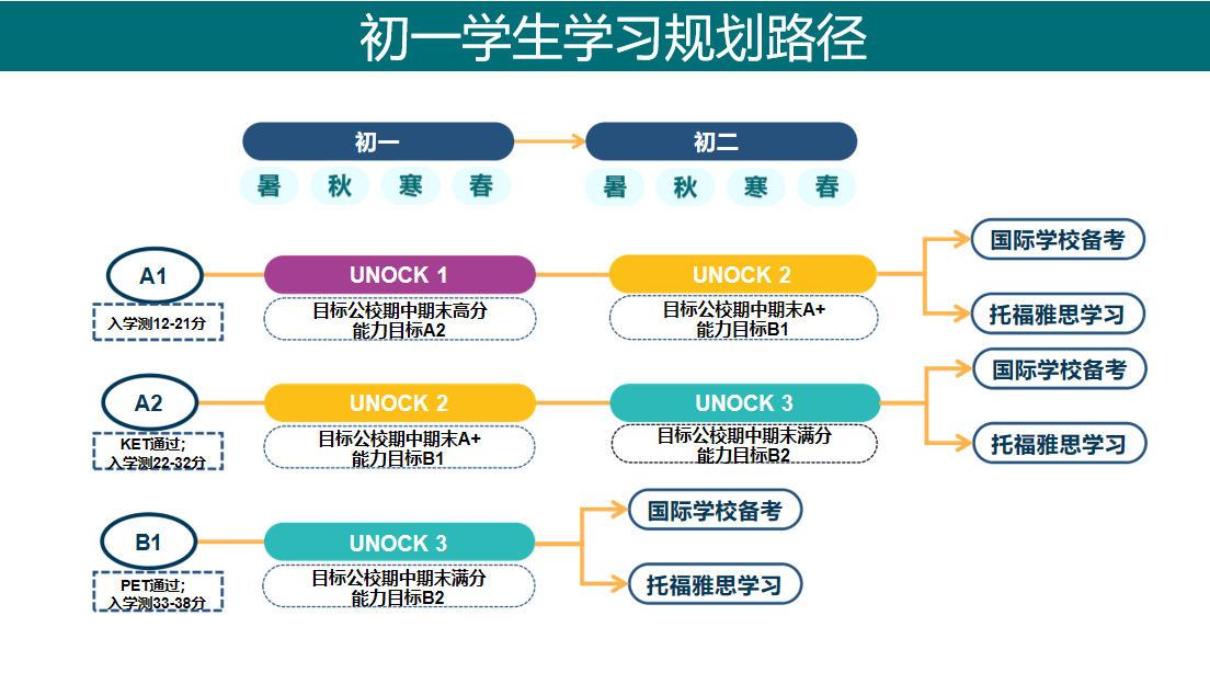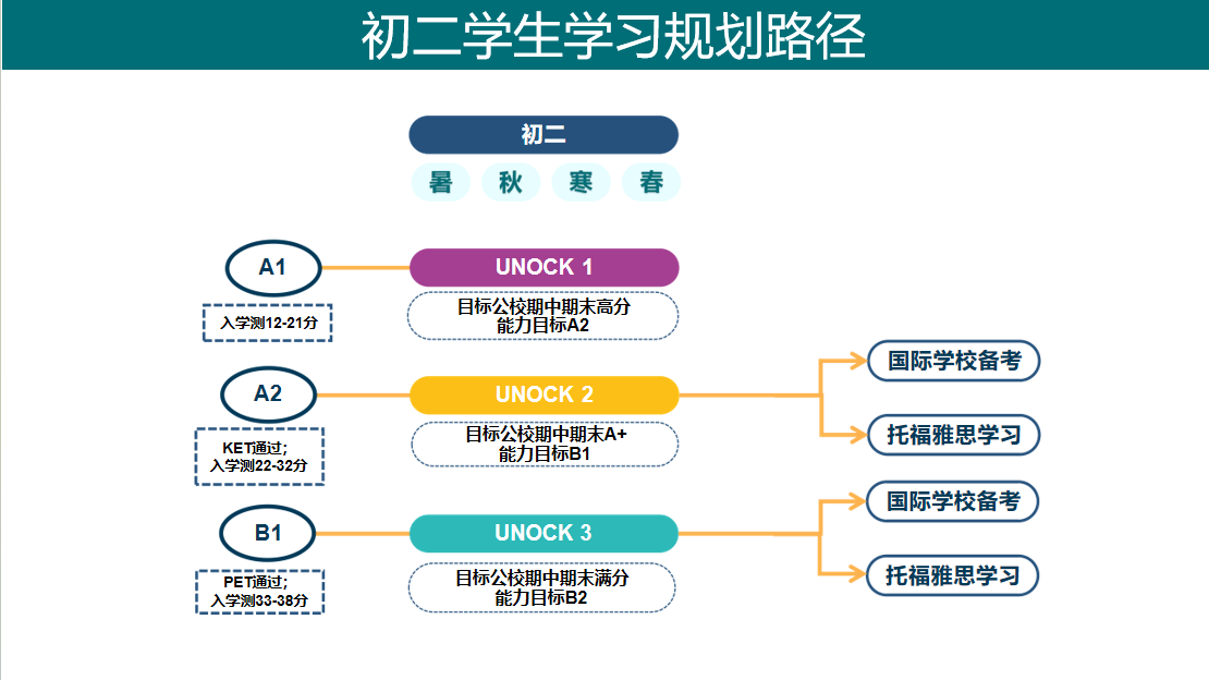 无论你的目标是提前托福雅思学习,还是衔接国际学校备考,我们都为不同水平的孩子规划了最适合他的学习路径。