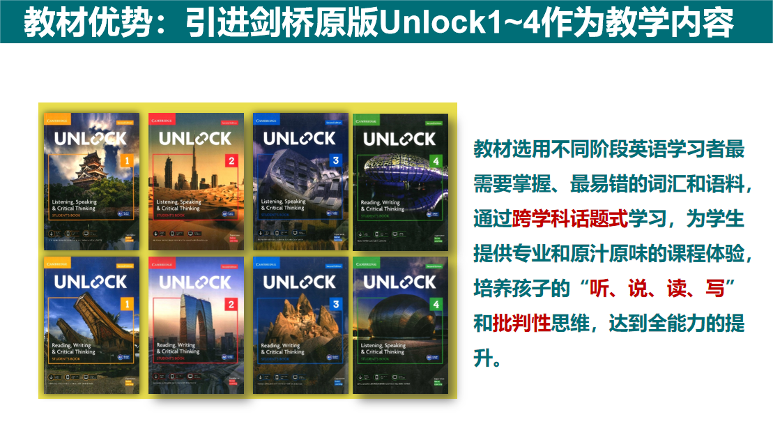 ·能力模块:从语言学习的本质出发,通过对接欧标的国际权威剑桥Unlock教材,帮助学生提升英语语言听说读写综合运用能力和思辨能力。