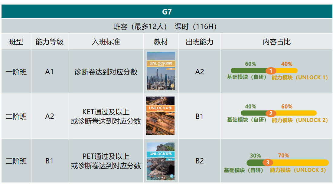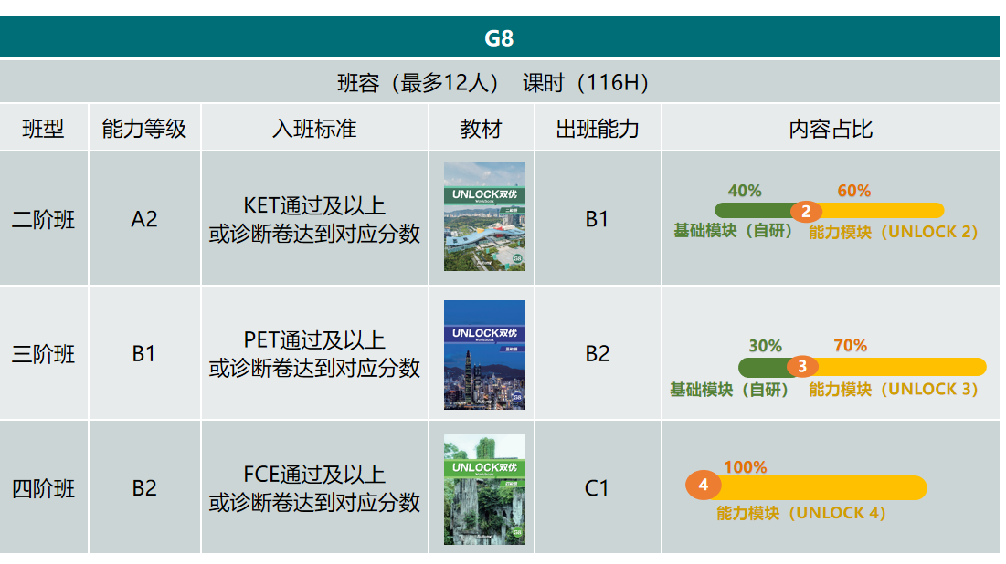 UNLOCK双优体系,秉承"高效夯实基础,全面提升能力"的设计理念,基于不同英语能力起点,设置多个班型,以不同比例呈现"基础"和"能力"两大学习模块。