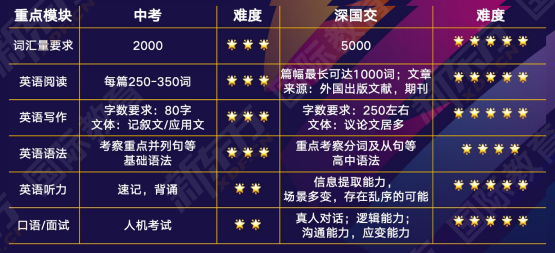 以深圳中考为参照,中考英语词汇量要求一般在1600-2000左右,而深国交的英语入学考词汇量要求至少在5000-7000左右,甚至更多。