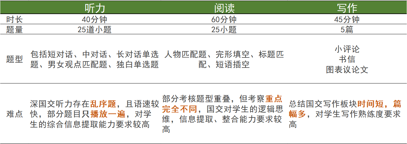 深国交入学考英语考核三个板块:听力(40分钟)、阅读(60分钟)、写作(45分钟)。