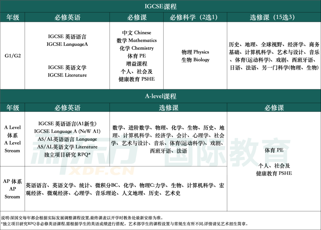 前两年学习IGCSE课程,分为G1、G2年级;后两年学习A-level(AS、A2)或AP(大学预科)。