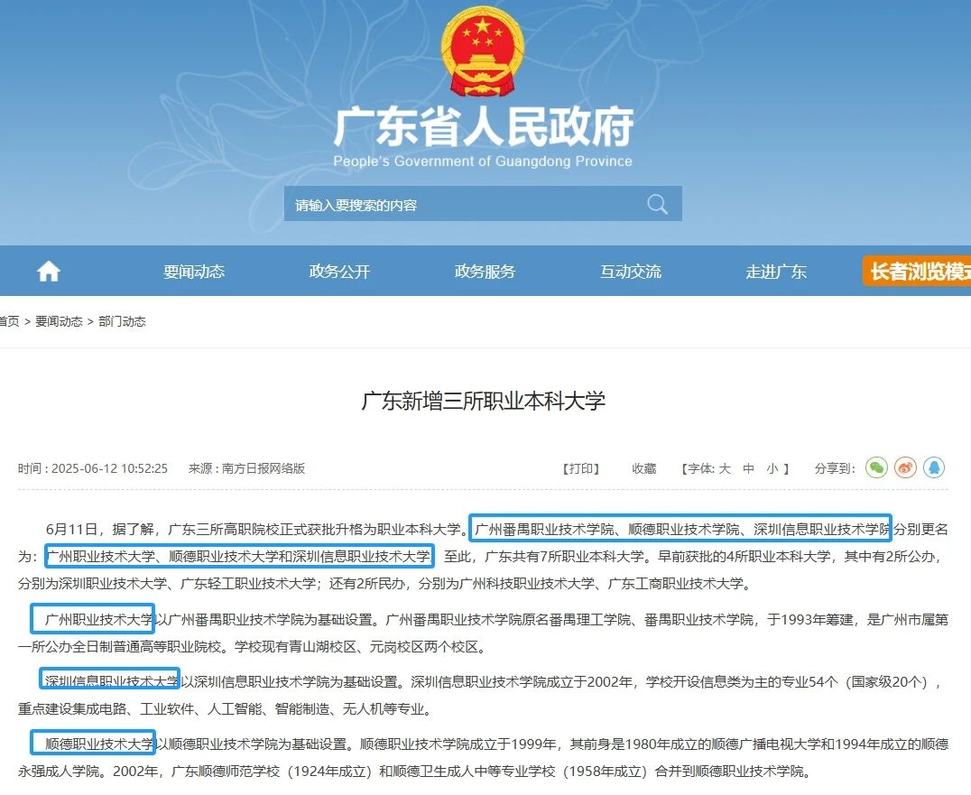 2025年6月,广东职业教育再传佳音: 广州番禺职业技术学院、顺德职业技术学院、深圳信息职业技术学 三所优质高职正式升格为职业本科大学,分别更名为广州职业技术大学、顺德职业技术大学和深圳信息职业技术大学。