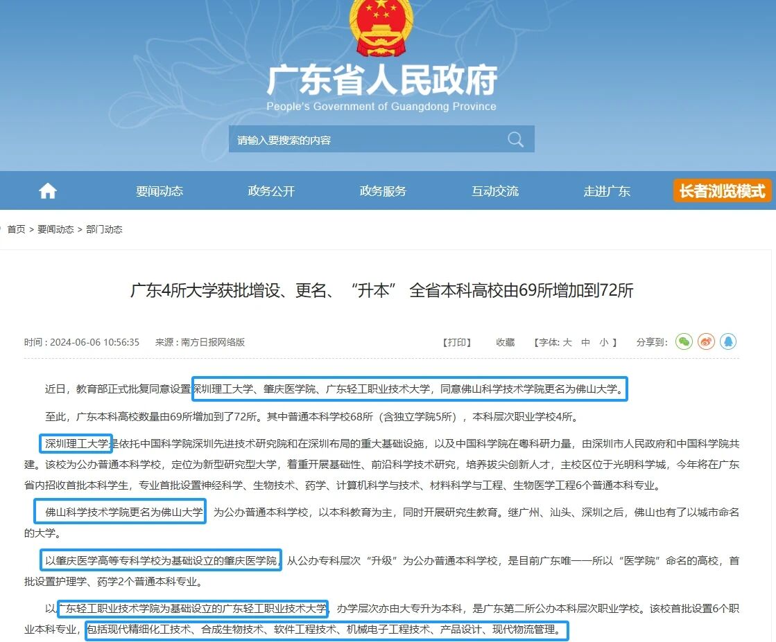 2024年5月,教育部正式批准设置深圳理工大学、肇庆医学院、广东轻工职业技术大学,同时同意佛山科学技术学院更名为佛山大学。这一调整使广东本科高校数量由69所增至72所,为专插本考生提供了更丰 富的择校空间。