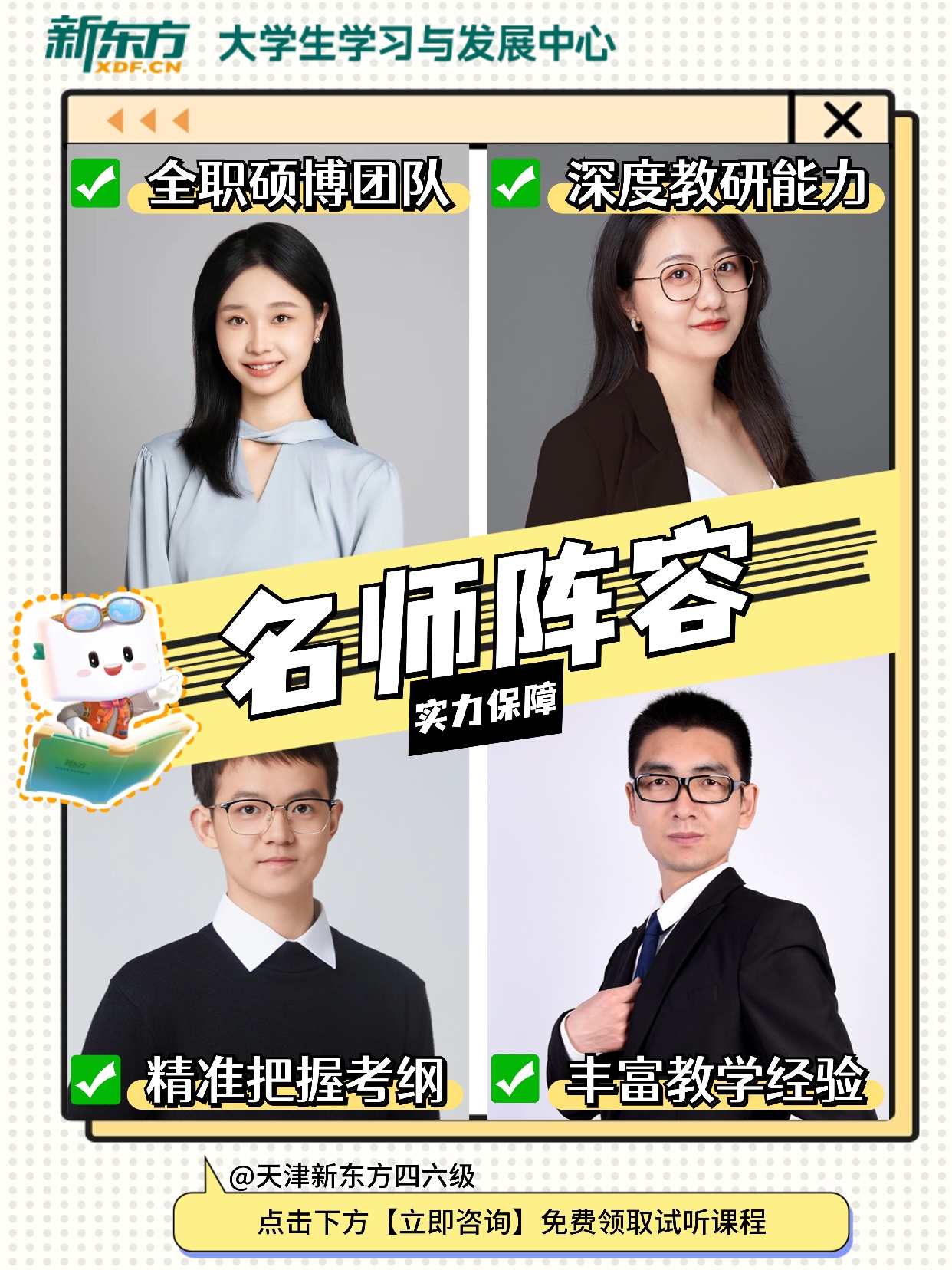 如果您想获取更多关于英语六级的独家复习资料和备考策略,欢迎关注新东方四六级官网。对于课程详情、师资介绍及免费试听机会,欢迎直接点击右下方咨询窗口进行了解,我们将为您提供专业的备考规划。