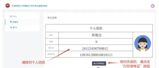 2.考生登录系统后,请认真核对个人信息,核对无误后,请点击屏幕下方"打印准考证"按钮。