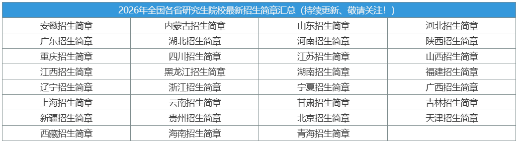 下面是由小编为您提供的部分内容,更多详细内容欢迎大家观看新东方考研官网,如有任何疑问,可联系客服老师咨询。随着2025年考研落下帷幕,2026年全国硕士研究生招生的备考工作已全面启动。本文为广大考生整理出“2026年全国各省研究生招生院校招生简章汇总”入口,旨在帮助备战2026年考研的同学,能够第一时间获取目标院校和专业的权威招生信息。