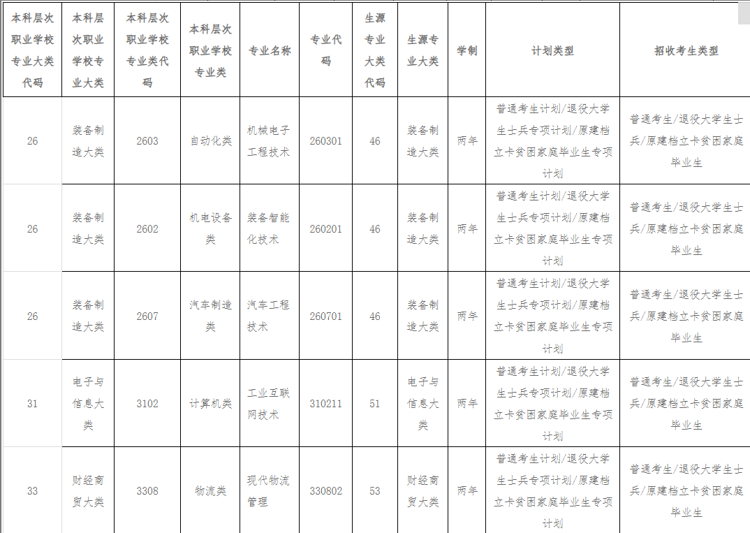 第八条 学校2026年普通高等教育本科层次职业学校专业大类招生专业。