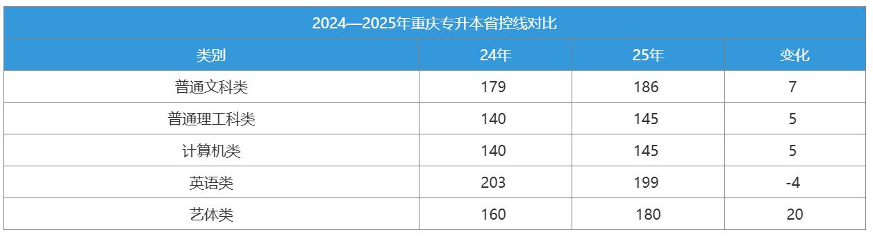 2024-2025年重庆专升本省控线有动态调整,普通文科类涨7分、普通理工科类和计算机类均涨5分,英语类降4分,艺体类涨幅达20分。不同类别分数线的变化,反映出重庆专升本各领域报考竞争态势的差异。对于重庆专升本考生而言,这些数据是了解招考难度、规划备考路径的关键参考,可结合分数线变动趋势,精准锚定目标类别,科学安排复习计划,提升备考针对性。