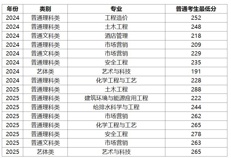 2025年重庆科技大学专升本专业有调整,新增建筑环境与能源应用工程、给排水科学与工程等。普通考生土木工程最低288分,较去年上涨;市场营销普通文科类最低263分。建卡考生各专业分数线也有变化,像土木工程建卡最低275分。