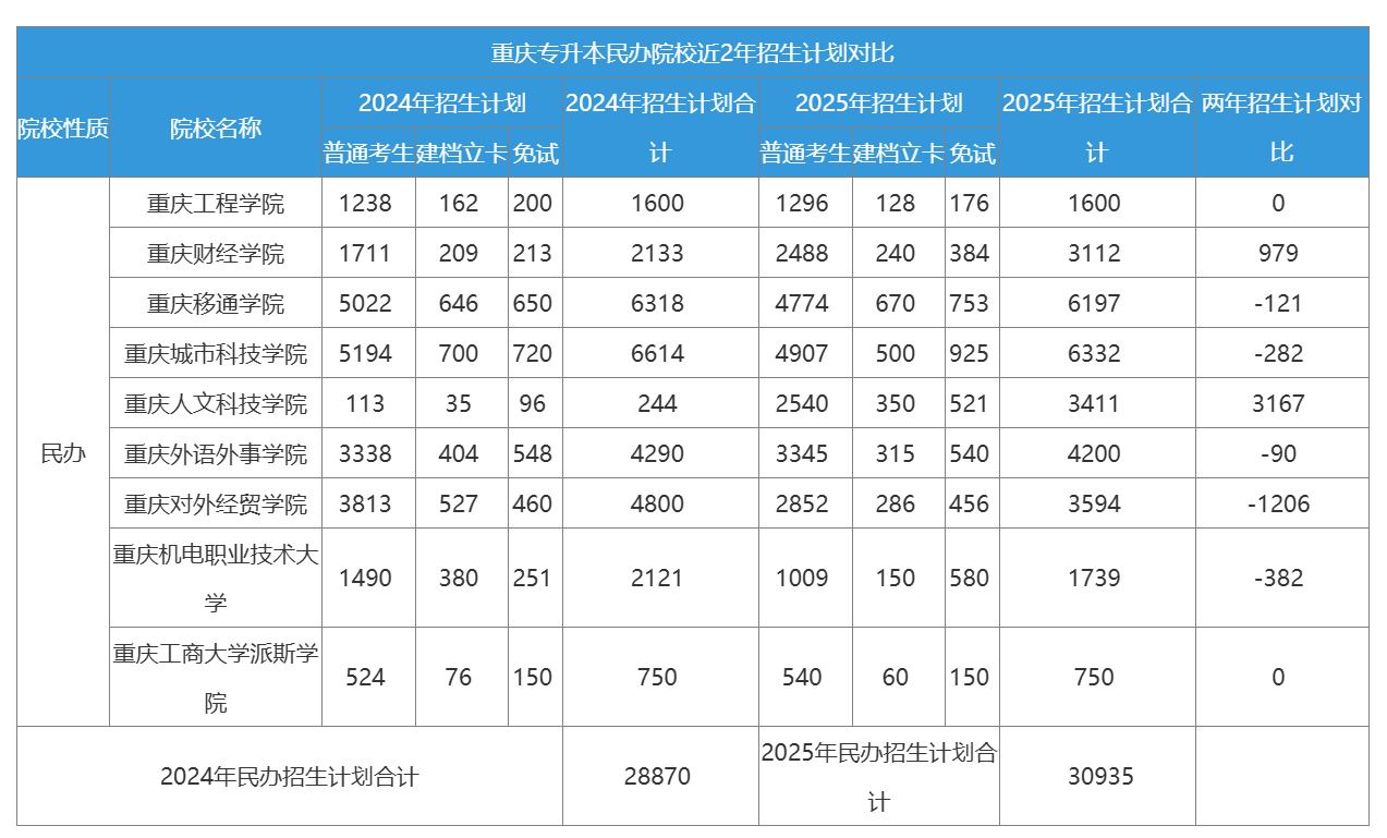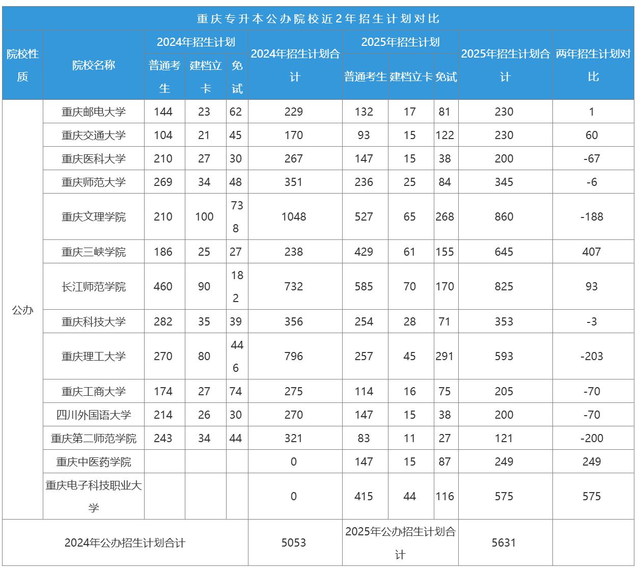 今年重庆专升本的总招生人数为36566人,比2024年多2643人。普通考生计划招生人数为27317人,比2024年多2108人。建档立卡招生计划人数3141人,比2024年少520人。免试生招生计划人数为6108人,比2024年多1055人。