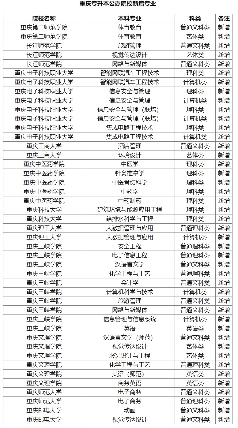 2025年重庆专升本公办院校中重庆第二师范学院新增体育教育专业,长江师范学院新增旅游管理、视觉传达设计、网络与新媒体专业。详细数据参考下表。