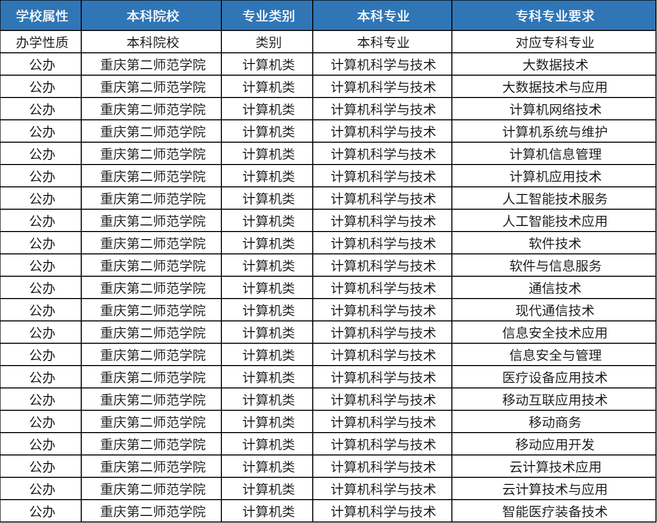 以下是2025年重庆专升本考试,重庆第二师范学院的计算机科学与技术招生的一览表,供大家参考。