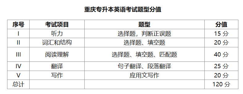 2026年重庆专升本考试英语题型共有五个部分,即听力、词汇和结构、阅读理解、翻译和写作。英语考试题型及内容整理如下。
