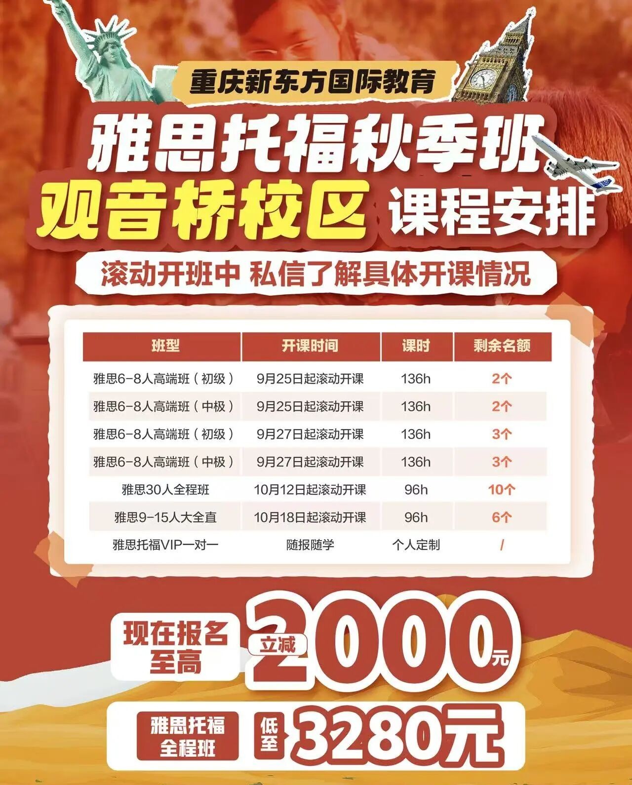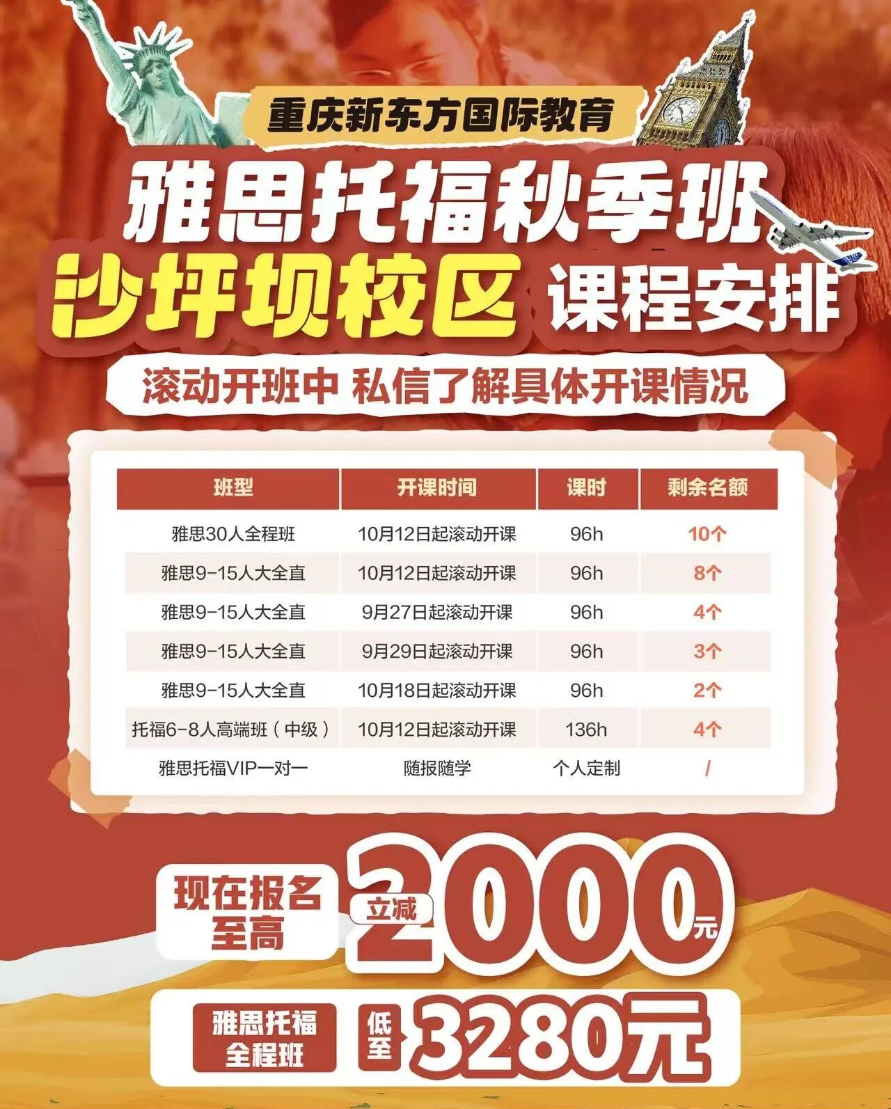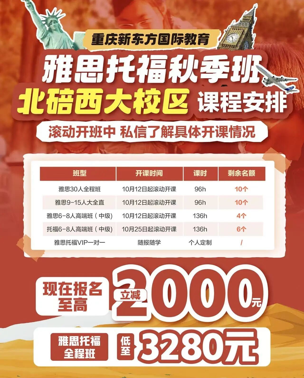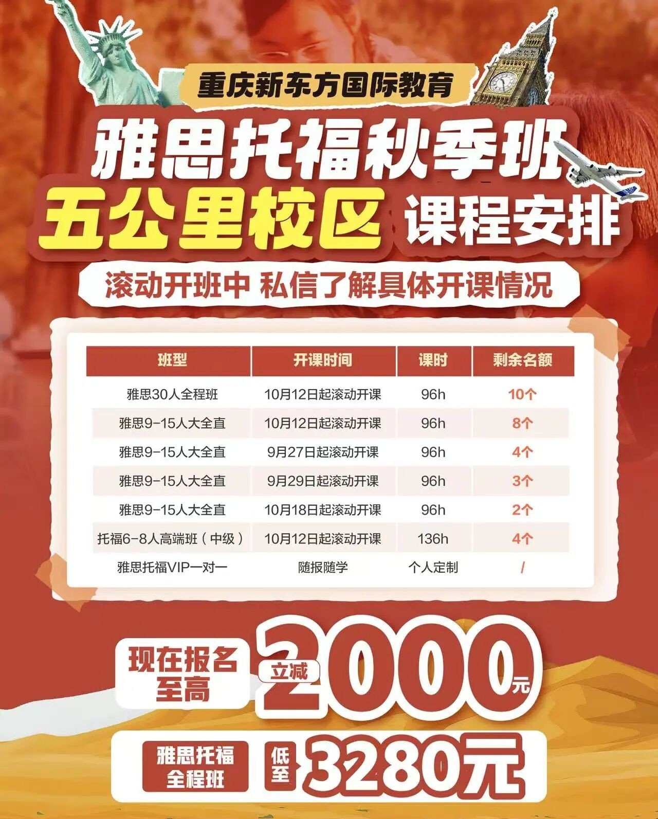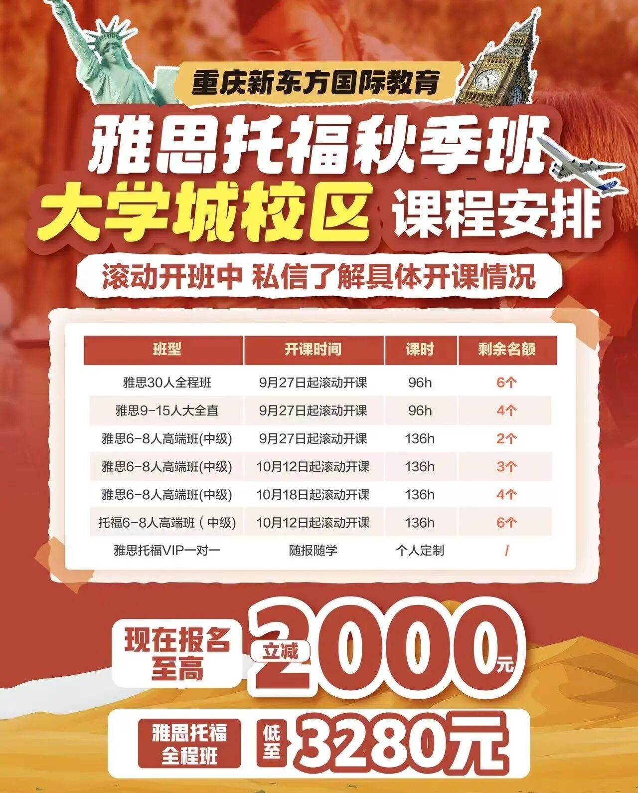 ? 重庆新东方雅思托福十大校区? 沙坪坝、渝北西政、观音桥、北碚西大、大学城、五公里、解放碑、杨家坪、南坪,爱琴海~秋季班全面滚动开班,无论你在主城哪个区,都能就近入学!?